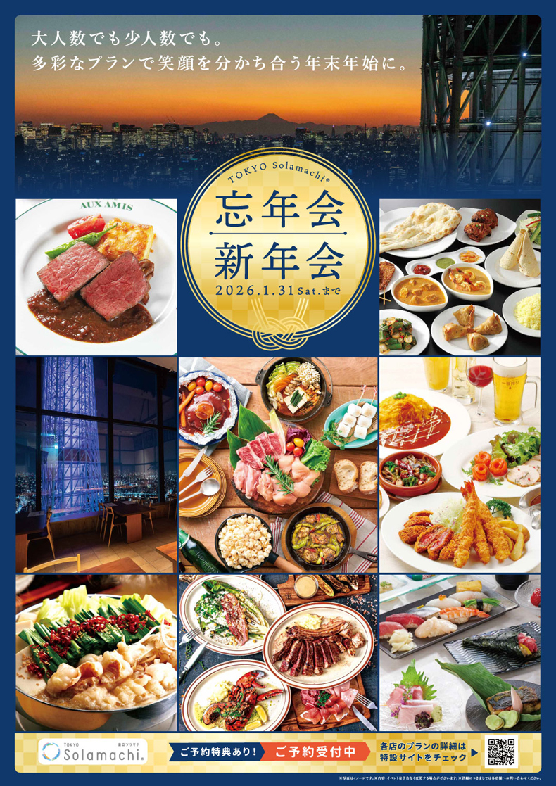 东京晴空街的餐厅提供非常适合年末和新年聚会的计划,为年末年初增添光彩。