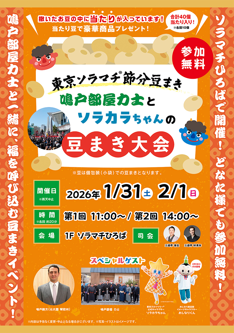 我们将举办掷豆仪式,参与者包括鸣人亲方(原大关欧洲)、《火影忍者》东京晴空塔®相扑手、官方角色Sorakara-chan,以及当地大成购物街的形象角色大成君。