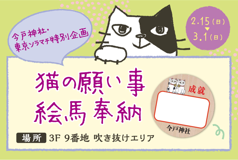 [猫祝福绘麻献词]浅草的今户神社,距离东京晴空塔城不远,被称为“招手猫的发源地”。请在与今户神社授予的绘玛相同的图案的绘玛贴纸上填写请求,我们把它放到面板上,♪绘马将在稍后献给伊玛多神社。我们期待您的参与。