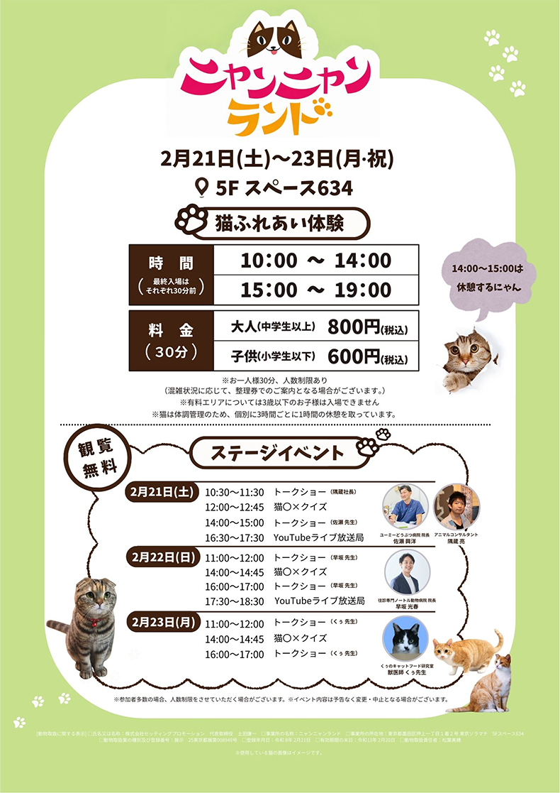 姓名:土田健一,Setting Promotion Co., Ltd. 代表董事 / 办公名称:Nyannyan Land / 办公地点:东京东京晴空街隅田区押山1-1-2 Space 634 5F / 动物处理业务类型及注册号:展览25 东京都会展览第008949号 / 注册日期:令和8年2月21日 / 有效期截止日期:令和13年2月20日 / 动物处理经理:松叶美穗