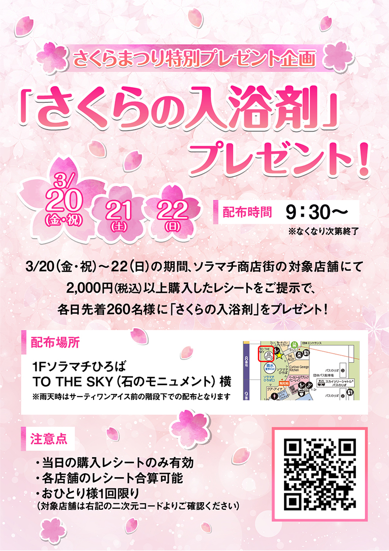 在3月20日(周五/节假日)~22日(周日)期间,每天前260名观众通过出示购买2000日元以上(含税)的收据,即可获得“樱花浴盐”,该收据位于晴空街购物街的参与商店。 在家享受樱花观赏的感觉吧!
