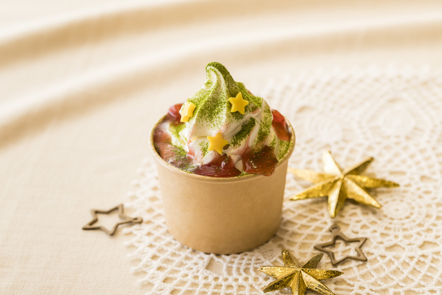 宇治抹茶的绿色、草莓酱的红色,以及带有星形巧克力的圣诞树形象。