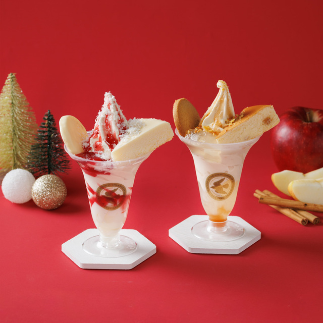 这个季节限定贩卖的『白色圣诞芭菲』,是在可以享受到奶油味的柔滑口感的意式奶冻上,重叠烤制芝士蛋糕风味的芝士蛋糕软冰淇淋,配上『御用府邸白色芝士蛋糕』『御用府邸白色巧克力芝士曲奇』,可以同时享受蛋糕和曲奇的原创芭菲。