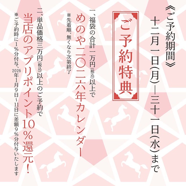 2026年开运福袋预约中!作为预约特典,福袋合计1万日元以上赠送目野屋2025年日历!(售完为止)