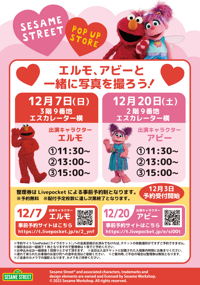 芝麻街快闪店 欢迎活动将于2025年12月7日星期日举行,届时你可以见到艾摩,2025年12月20日星期六,你还能见到艾比。