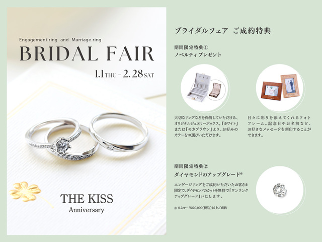 从2026年1月1日星期四到2026年2月28日星期六,我们为签署结婚戒指合同的客户提供丰厚THE KISS福利。