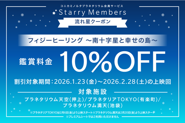 为纪念新作《Figy Healing~南十字星与幸福之岛~》的公映,向柯尼卡美能达天文馆会员服务“Starry Members”的全体会员发行可以10%观赏本作品的优惠券。