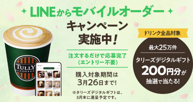 赢取价值200日元的Tully's数码礼品!LINE移动订单有限活动